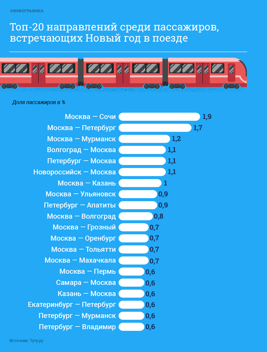 Самыми популярными маршрутами, на которых больше всего пассажиров встретят Новый год в поезде, оказались Москва — Сочи, Москва — Петербург и Москва — Мурманск. В то время как из Северной столицы самыми популярными конечными точками оказались Москва, Апатиты и Мурманск. Несмотря на то что добраться до любой точки быстрее на самолёте, его выбрали всего 1,6% от всех пассажиров, вылетающих 31 декабря.
