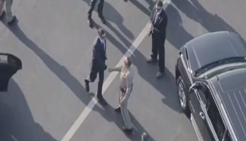 После этого он отправился в аэропорт, всё ещё в сопровождении правоохранительных органов, откуда вылетел на самолёте. По данным TMZ, воздушное судно принадлежит частной компании, но взято в лизинг Правительством США.