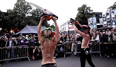 Обнаженные девушки FEMEN вновь спилили кресты, на этот раз специально для этого установленные в голландском городе Энсхед.