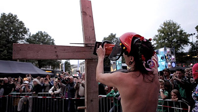 - Нас пригласили организаторы фестиваля GOGBOT, потому второй день был посвящен Pussy Riot. У организаторов была задумка непосредственно показать протест против церкви, - рассказала Life News лидер движения FEMEN Анна Гуцол. - Нас также позвали потому, что мы являемся очень опытными по спиливанию крестов.