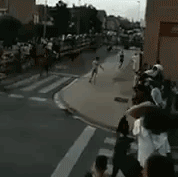 Сначала бык, который вот-вот должен был атаковать парня, врезается в стену, но его настигает сразу несколько других быков. Он ловко лавирует между животными, но в конце концов падает на асфальт, обрекая себя на погибель. Внезапно на быка, который приготовился атаковать молодого человека, нападает его сородич, и парню удаётся спрятаться за оградой.