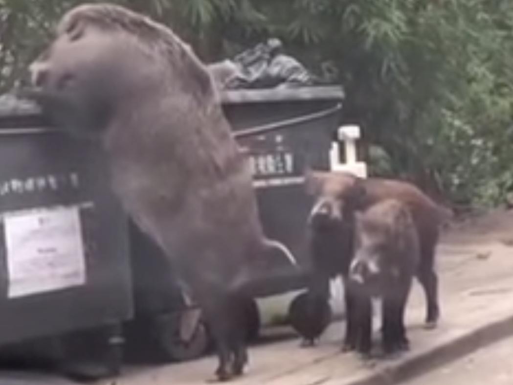 Дикий кабан вместе со своими маленькими сородичами копался в контейнере с мусором. Животное не обращало никакого внимания на проходивших мимо людей, которые шли в учебное учреждение за своими детьми после занятий.