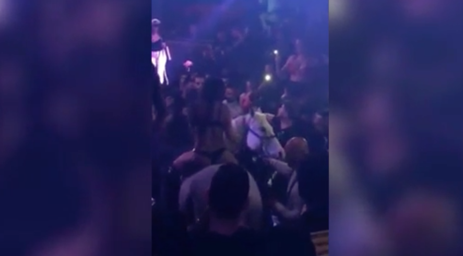 На опубликованных кадрах белая лошадь расхаживает по танцполу среди гостей, а также катает на себе девушку в нижнем белье. Затем животное спотыкается и роняет свою наездницу, зрители же встречают происходящее аплодисментами.