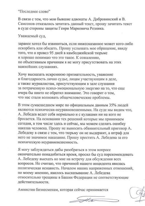 Сергей Полонский попросил передать данное обращение адвокату Генри Резнику в связи с отказом его адвокатов А. Добровинского и В. Самсонова от устного оглашения данного документа.