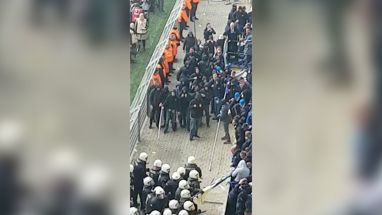 По данным Deutsche Welle, болельщики "Герты" вступили в конфликт с сотрудниками полиции, которые сняли один из баннеров. Начавшись на трибунах, потасовка продолжилась в подтрибунных помещениях. Отмечается, что фанаты использовали пиротехнику, древки от флагов и другие подручные предметы. В ответ на это стражи правопорядка использовали слезоточивый газ.