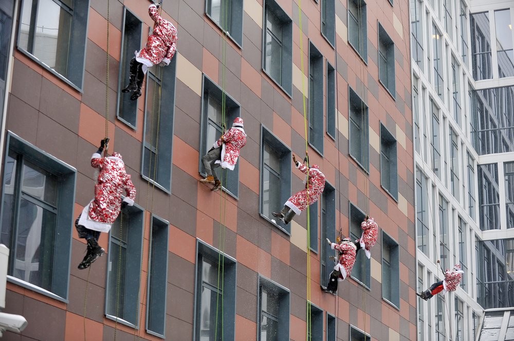 Целый десант Дедов Морозов и Снегурочек спустился с крыши Морозовской детской больницы в Москве и поздравил маленьких пациентов через окна. В роли бородатых волшебников выступили столичные спасатели.