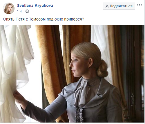 Заместитель главного редактора портала "Страна.ua" Светлана Крюкова посчитала, что Тимошенко задумалась после того, как увидела Порошенко с томосом. Другие пользователи "Фейсбука" уверены, что Тимошенко читает надписи на асфальте.