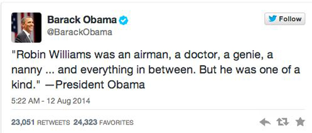 Актеры, знакомые и друзья Робина Уильямса отдают актеру дань памяти. Соболезнования его семье выразил, в частности, президент США Барак Обама. В "твиттере" хештэги "Робин Уильямс" и Robin Williams занимают лидирующие позиции.
