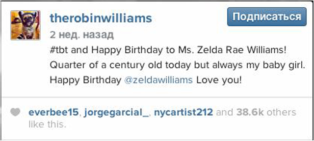 Фотография была размещена Уильямсом в день 25-летия дочери. Надпись под ней гласит: "И архивное фото: с днем рождения, миссис Зельда Рей Уильямс! Прошла уже четверть века, ты повзрослела, но все равно остаешься моей любимой девочкой. С днем рождения, @zeldawilliams, люблю тебя!"