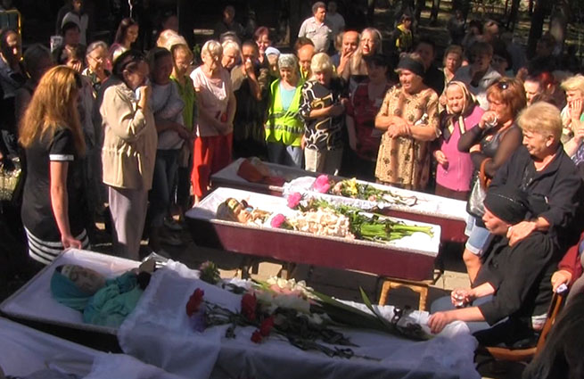 Родственники и соседи пришли на похороны, чтобы проститься с близкими людьми. Они в ужасе от того, что Донецк постоянно находится под огнем силовиков. Но главным образом людей волнует вопрос, за что их убивают.