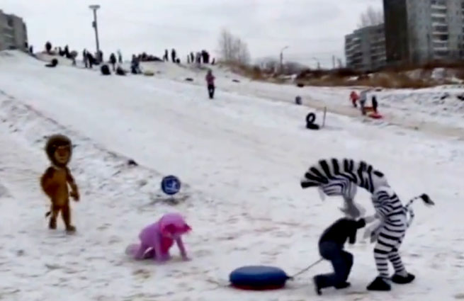 Отдыхающие в одном из красноярских парков засняли драку между ростовыми куклами и подвыпившим посетителем. Инцидент произошел после того, как мужчина решил силой отобрать у зебры Марти из мультфильма «Мадагаскар» голову.