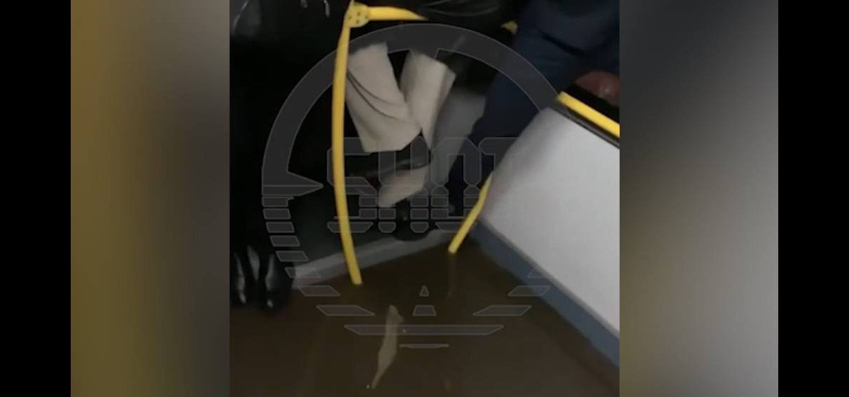 На кадрах видно, как автобус заглох в огромной луже и салон сразу затопило потоком воды. Пассажиры были вынуждены спасаться от стихии, залезая на поручни и сиденья.