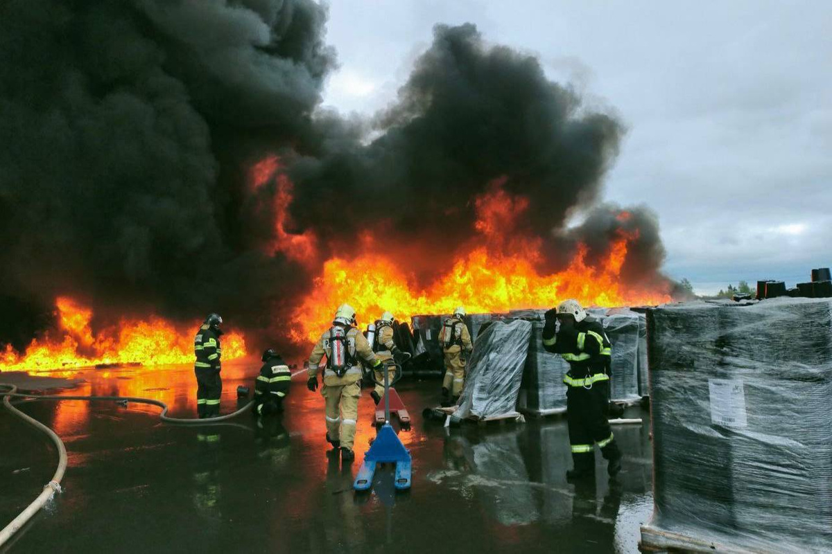 По данным МЧС, в тушении пожара задействованы более 70 человек и 26 единиц техники. При этом есть угроза распространения огня на соседний склад. В настоящее время мобильная лаборатория проводит замеры воздуха на предмет превышения допустимой концентрации вредных веществ.