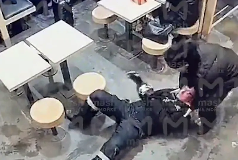 Камеры видеонаблюдения сняли, что охранник пытается выкинуть нетрезвого мужчину из кафе Rostic's в Петербурге. Видео © T.me / "Mash на Мойке"