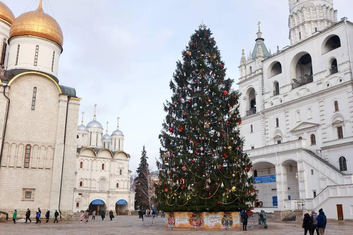 На Соборной площади Кремля установили и украсили главную новогоднюю ёлку России