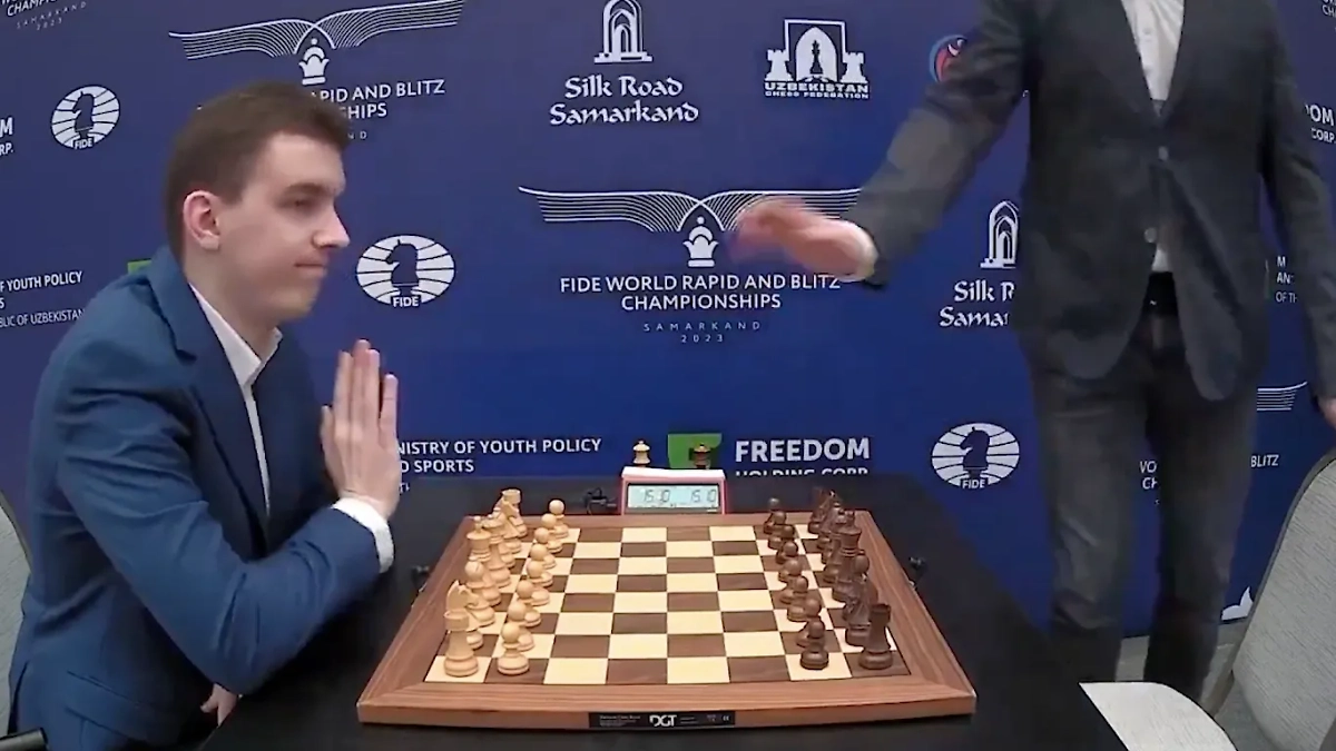 Польский гроссмейстер Ян-Кшиштоф Дуда отказался жать руку россиянину Денису Хисматуллину. Видео © X / Lord Bebo