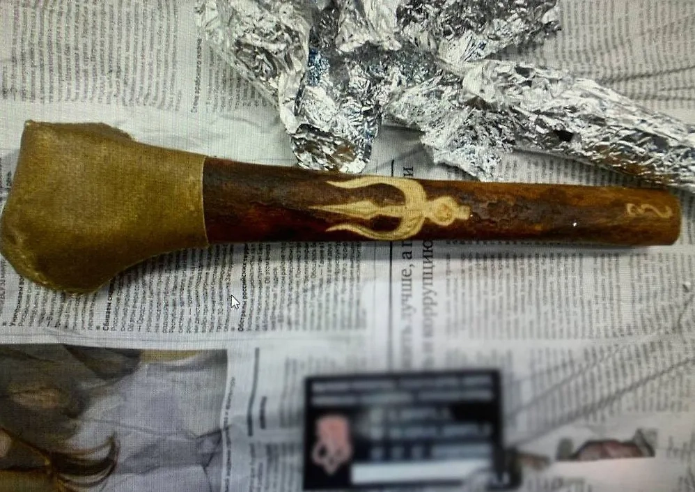Необычную находку выявили с помощью рентгеновской установки. В ходе досмотра таможенники достали завёрнутую в газету полую кость с вырезанным трезубцем и авторским клеймом. При этом в декларации отправитель указал, что пересылает просто музыкальный инструмент.