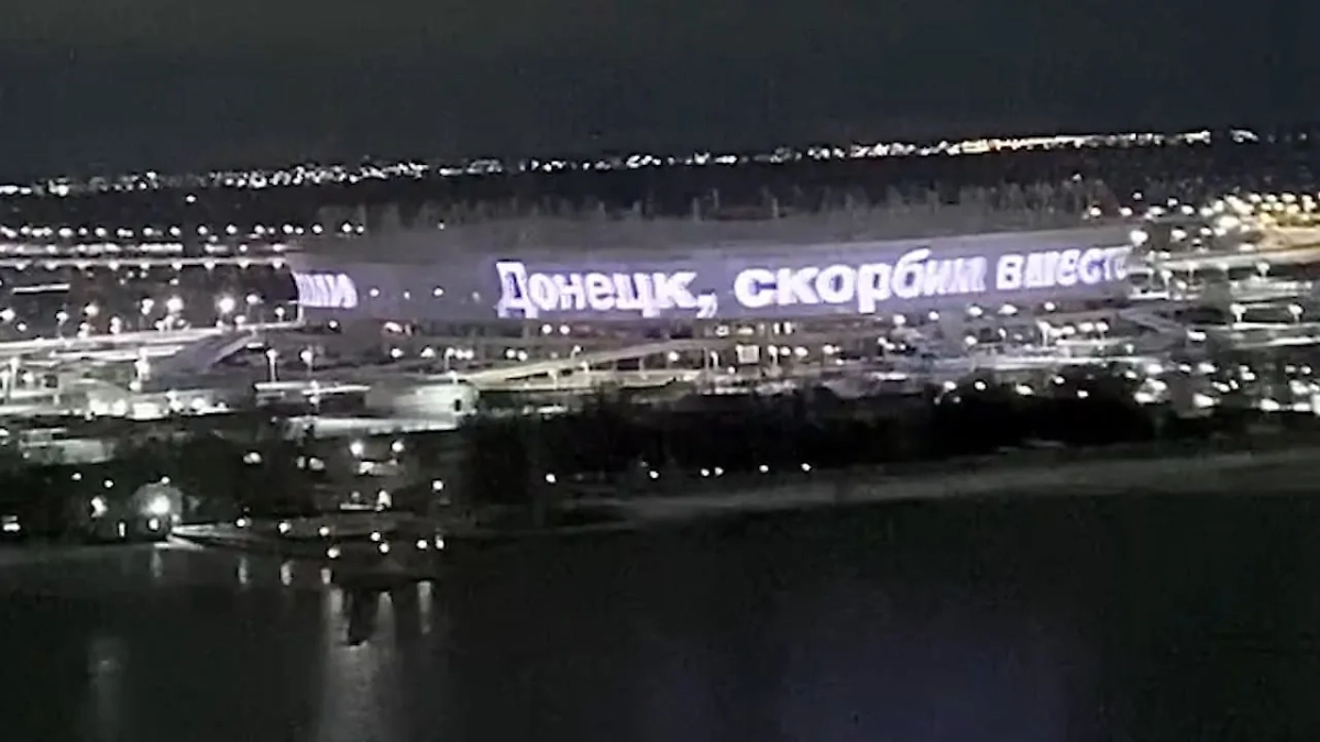 "Донецк, скорбим вместе с вами", — такие слова появились на фасаде стадиона.