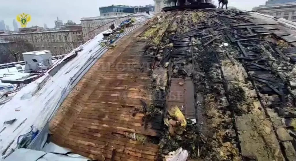 В объектив камеры попал сгоревший купол театра. Деревянная обшивка частично обуглилась, повреждения получили также плиты утеплителя. Сотрудники экстренных служб разбирают обгоревшие конструкции и анализируют масштаб урона.