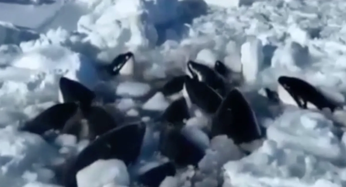 Косатки, попавшие в ледяной плен у Хоккайдо. Видео © NHK
