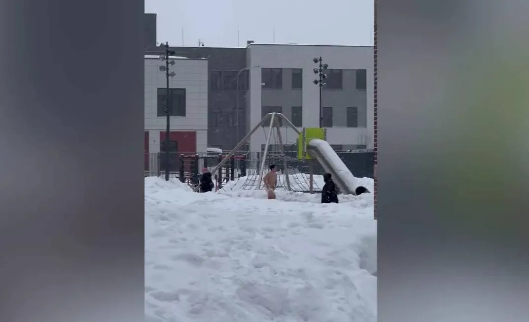 На юге Москвы заметили голого пациента наркологической клиники. Очевидцы засняли, как абсолютно обнажённый мужчина, прикрываясь маленькой тряпочкой, бегал с криками по дворам, несмотря на мороз и сильную метель.
