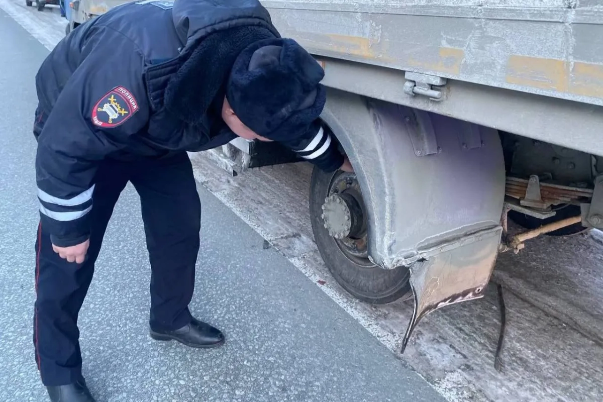 Сотрудник ГИБДД осматривает фуру, от которой отлетело колесо и убило девушку в Свердловской области. Обложка © Telegram / ГИБДД Свердловской области