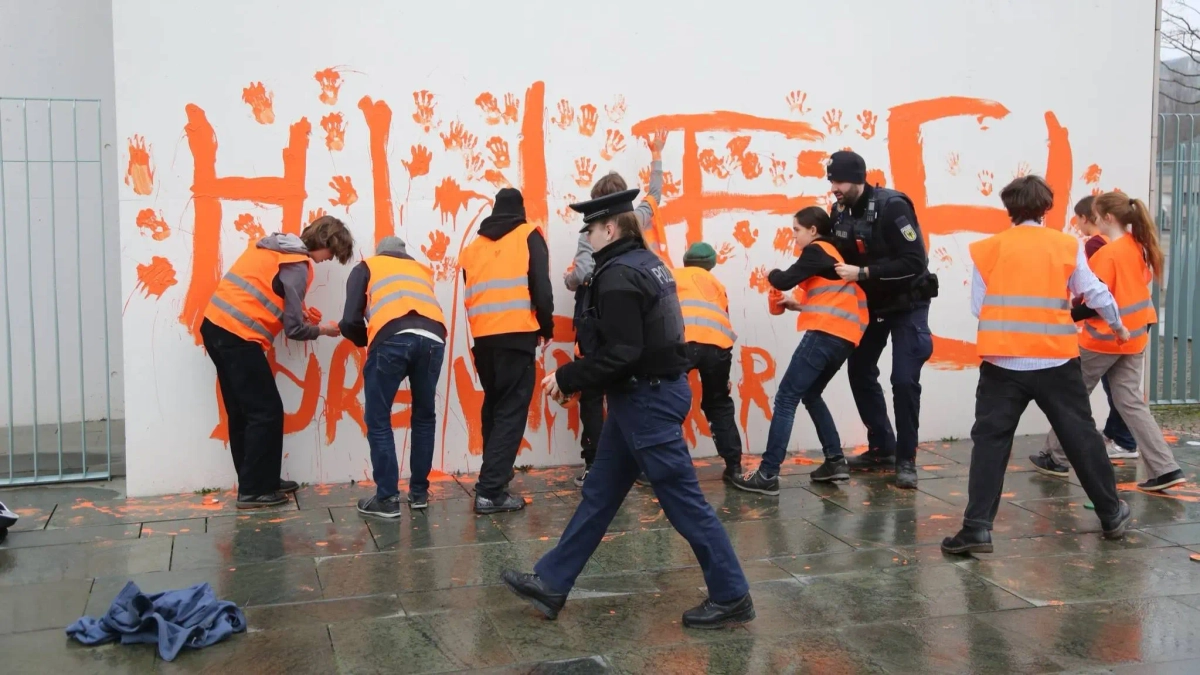 Экоактивисты движения "Последнее поколение" (Letzte Generation), наиболее известные своими протестными акциями, разрисовали фасад ведомства канцлера в Берлине. Протестующие написали на нём: "Помогите! Ваши дети" и оставили отпечатки рук.
