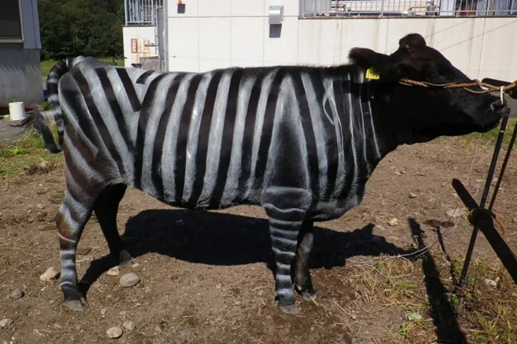 В японской префектуре Ямагата фермеры придумали необычный способ, чтобы защитить коров от надоедливых насекомых. Как сообщает South China Morning Post (SCMP), скотоводы стали маскировать бурёнок под зебр с помощью характерной полосатой раскраски.