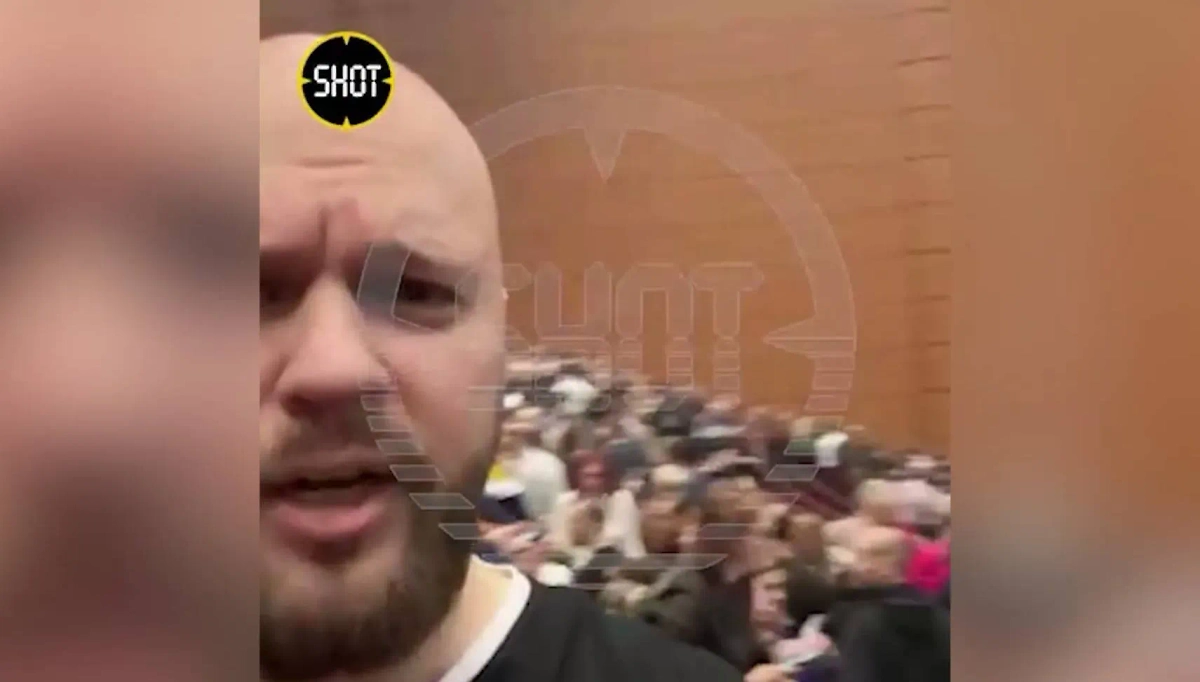 "Стреляют из автоматов! Стреляют по толпе! Зал горит, нас подожгли!" — кричал автора ролика на фоне звуков стрельбы.