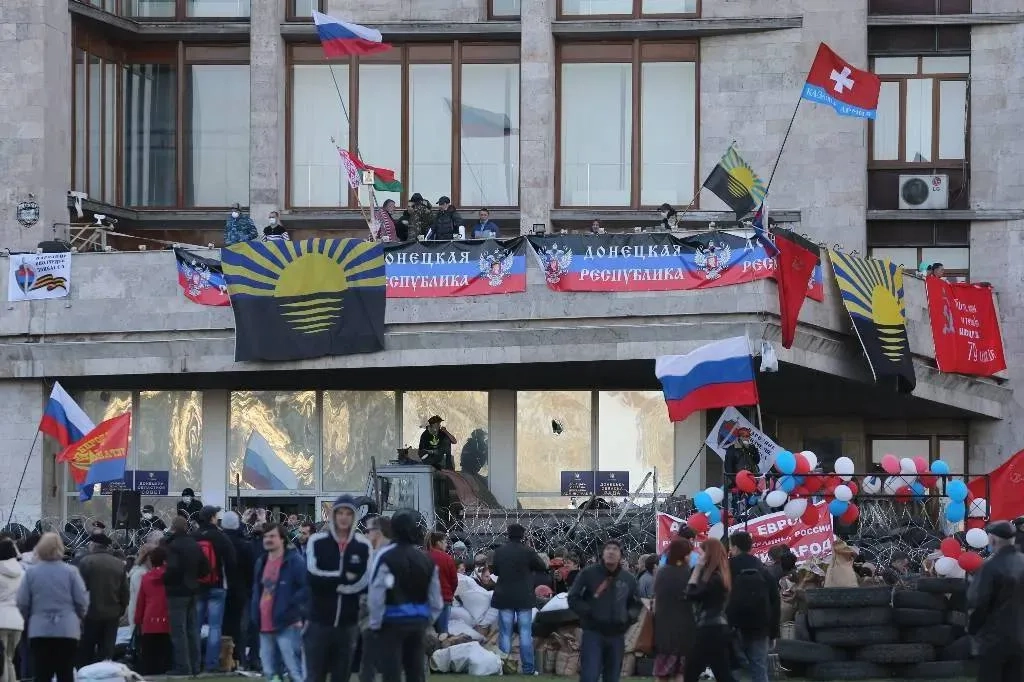 Участники протестных акций у здания Донецкой областной администрации, 8 апреля 2014 года. Обложка © ТАСС / Михаил Почуев
