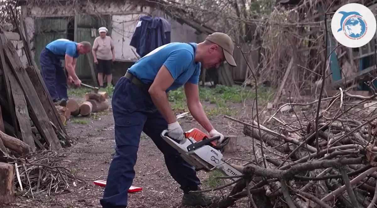 Волонтёры Гумкорпуса накололи дрова пожилой жительнице ЛНР. Видео © Telegram / Гуманитарный Добровольческий корпус