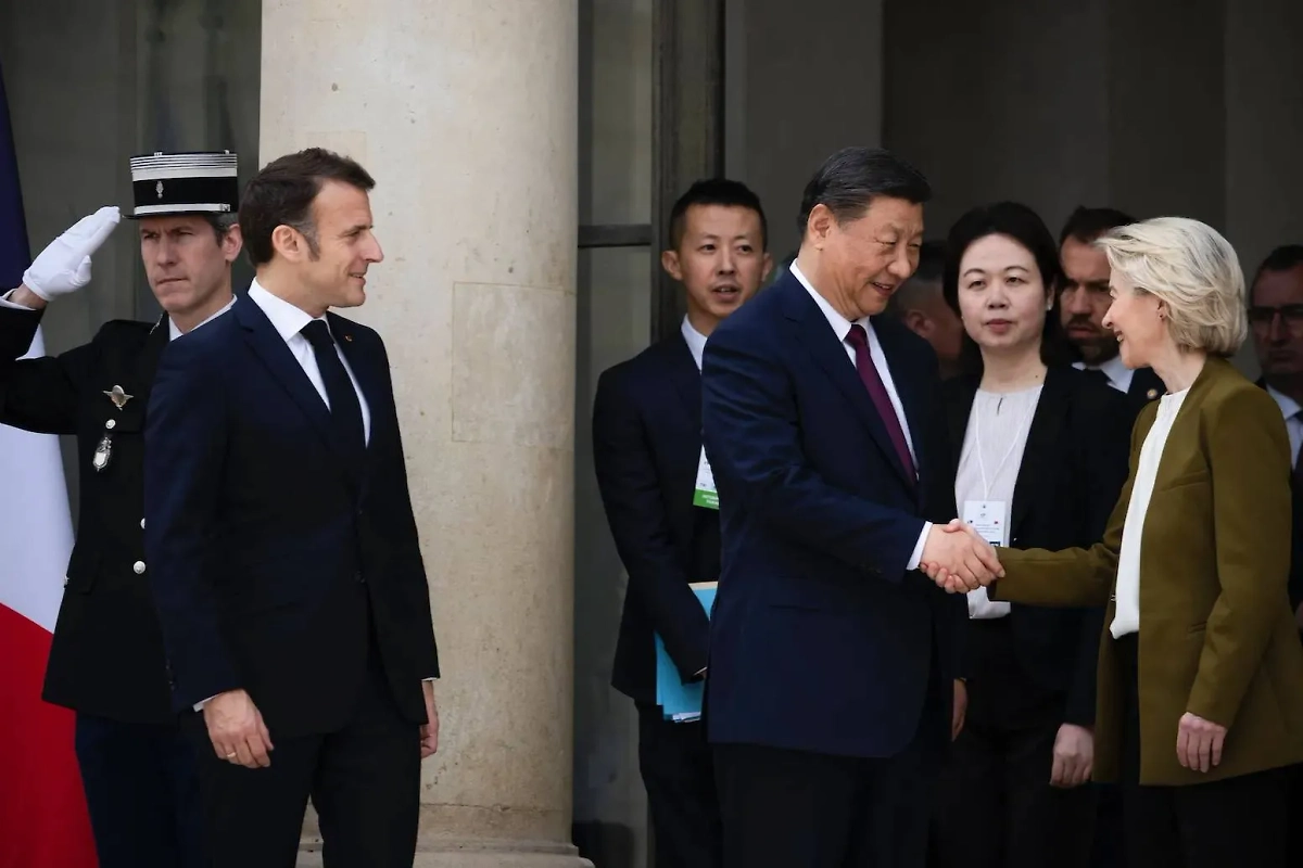 Си Цзиньпин пожимает руку фон дер Ляйен, пока Макрон стоит в стороне. Обложка © ТАСС / ABACA / Blondet Eliot