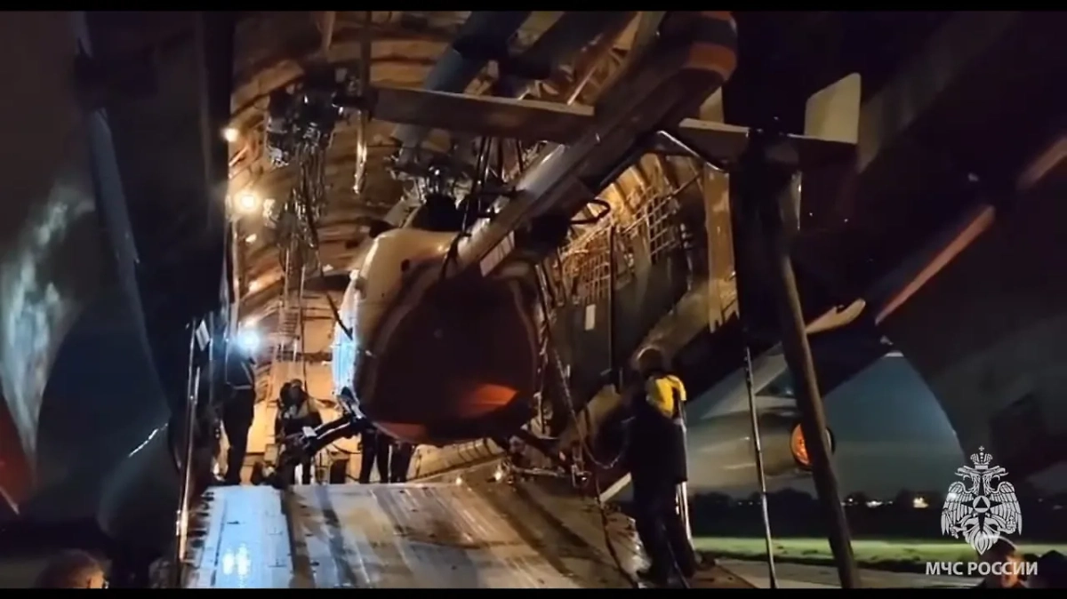Кадры погрузки вертолёта отряда "Центроспас" в самолёт Ил-76 МЧС России. Видео © Telegram / МЧС России