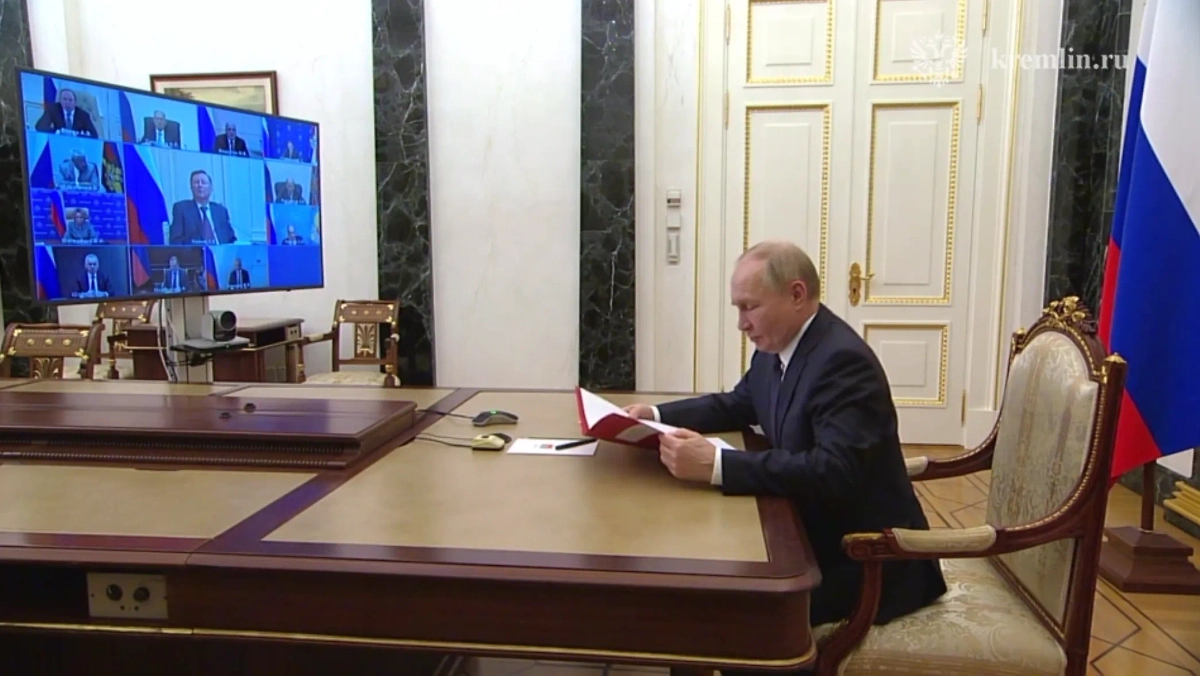 Президент РФ Владимир Путин в режиме видеоконференции провёл оперативное совещание с постоянными членами Совета безопасности. Видео © Telegram / Кремль. Новости