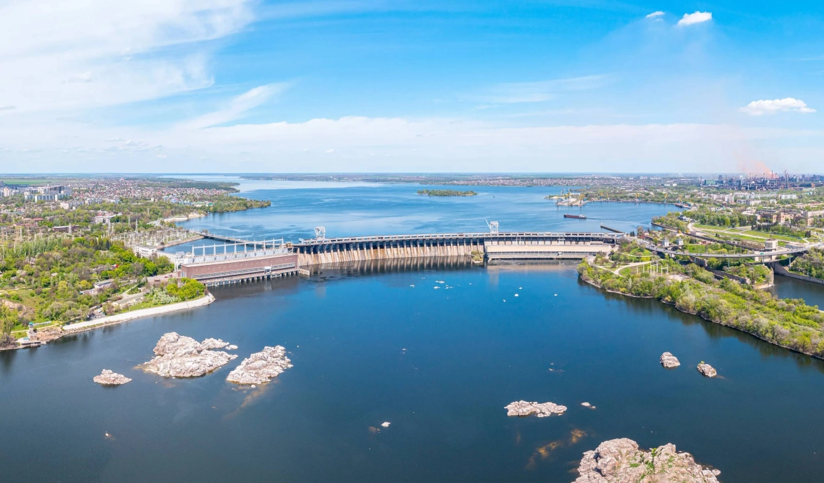 Днепрогэс в Запорожье, вид с высоты птичьего полёта. Обложка © Shutterstock / FOTODOM / ZagAlex