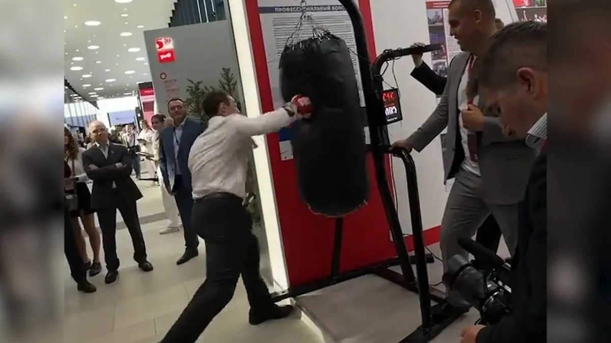 Чемпион мира по боксу Марк Петровский ударил грушу на ПМЭФ. Видео © Telegram / News Media Room