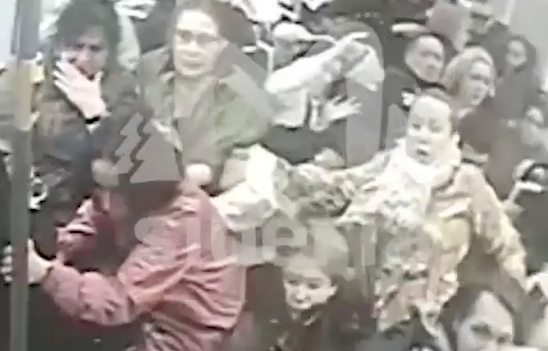 Момент столкновения и эвакуации из вагона в Кемерове, в который врезался трамвай без тормозов. Видео © Mash Siberia