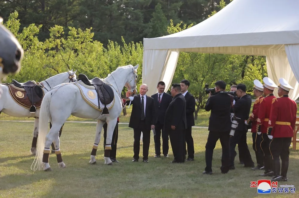 Судя по опубликованным снимкам, Путин и Ким Чен Ын прогулялись по резиденции, побеседовали, а также вместе осмотрели белых рысаков. На одном из снимков лидер КНДР кормит одну из лошадей морковкой.