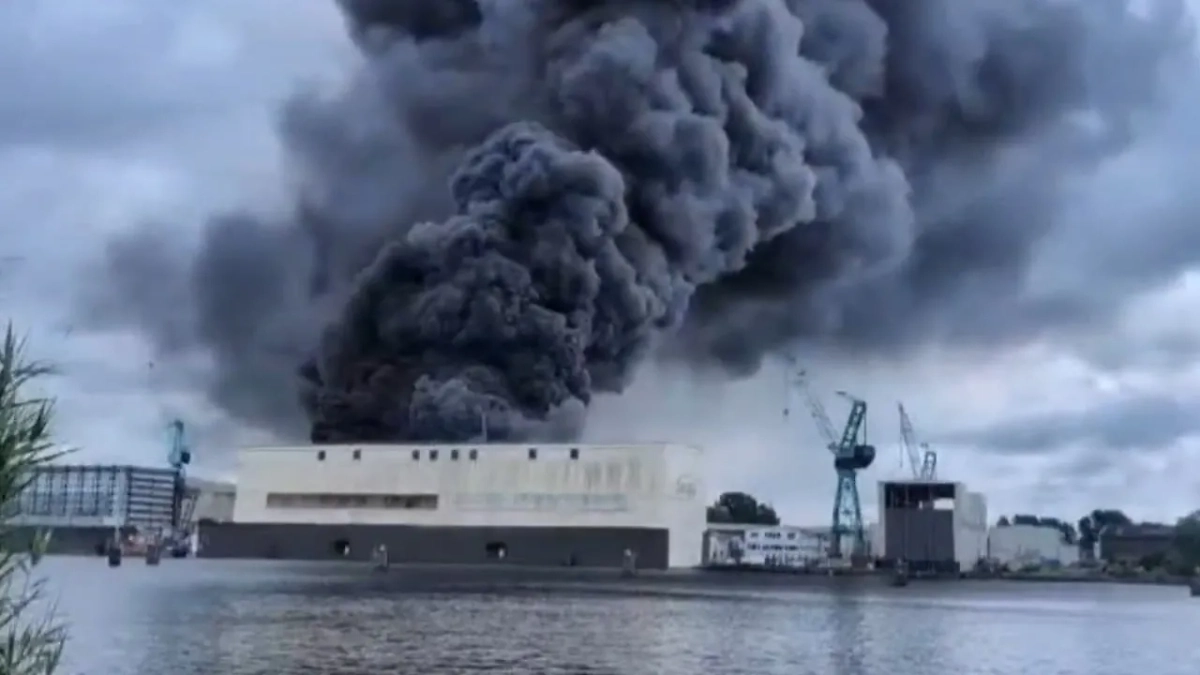 Пожар на верфи Люрссен на севере Германии. Видео © YouTube / Pirlz