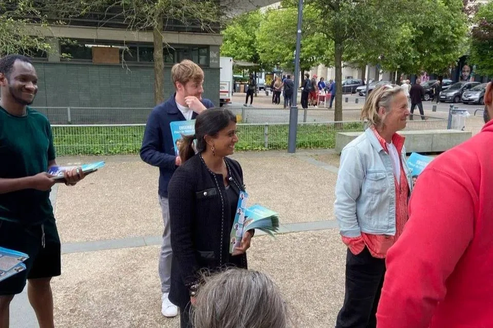 Приска Тевено (в центре) со сторонниками на предвыборной акции незадолго до нападения. Обложка © X / Prisca THEVENOT