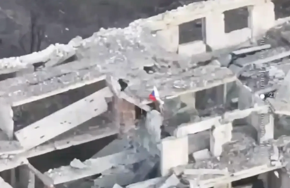 Видно, как российский военнослужащий разворачивает флаг на крыше разрушенного здания. Как далеко отступили ВСУ, не уточняется.