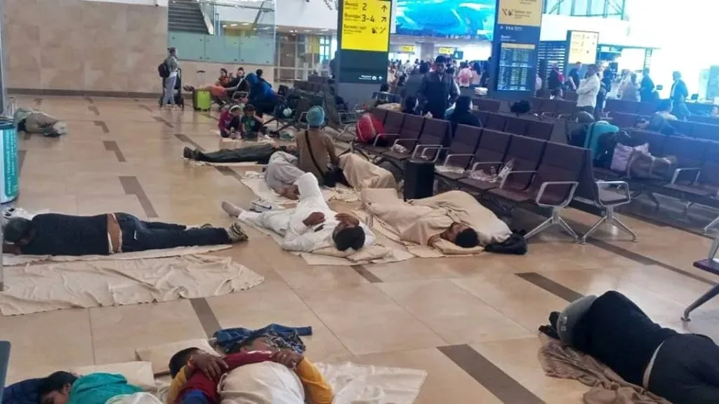 Пассажиры спят на полу после экстренной посадки индийского Boeing 777 в Красноярске. Обложка © Telegram / Дела.ru