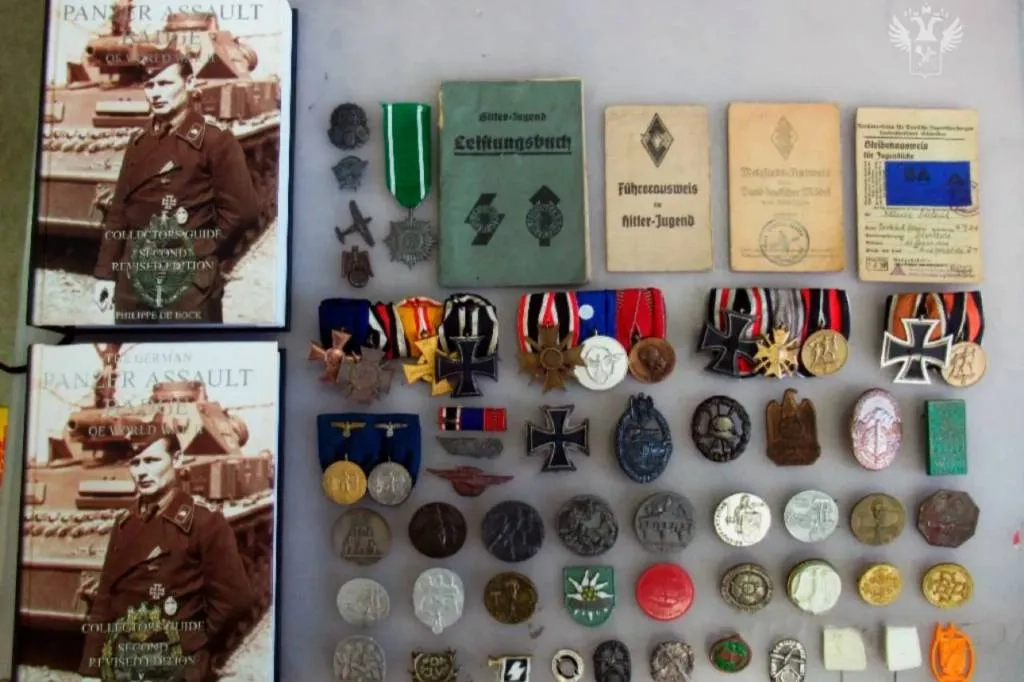 "Изъяты наградные кресты 1913–1925 годов, медали, знаки отличия и значки 1933–1945 годов, среди них Железный крест Третьего рейха, медали за выслугу в вермахте, крест "За военные заслуги" второй степени, значок с имперским орлом и другие", — гласит пост.