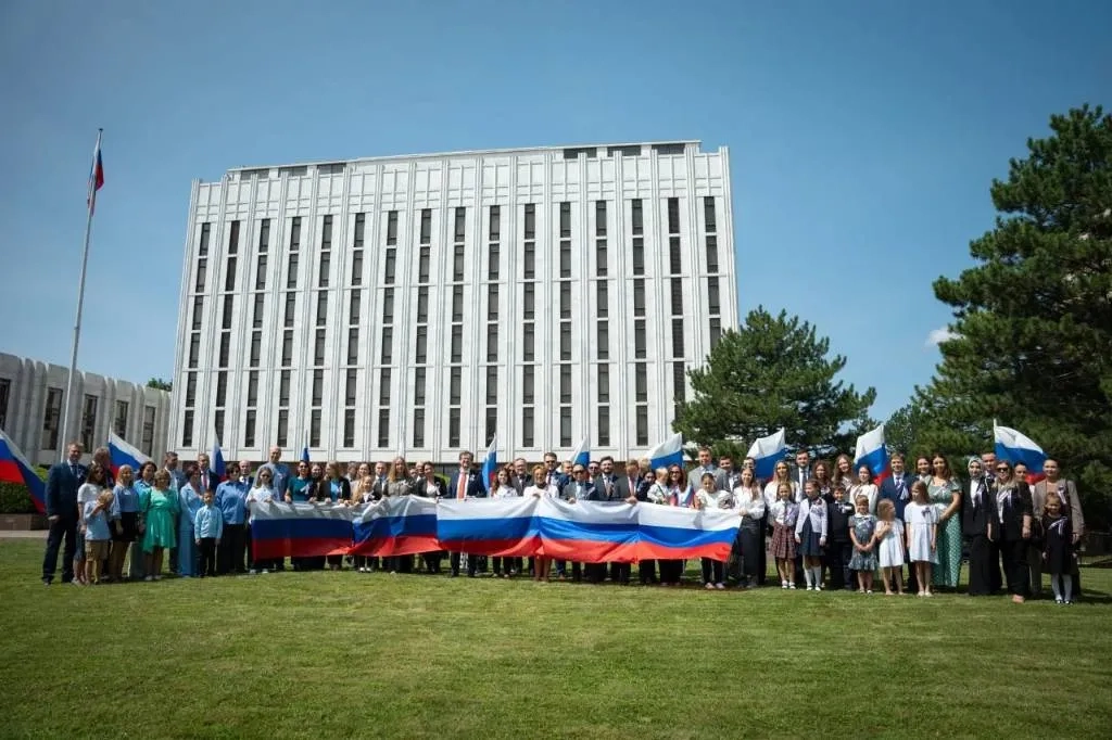 Сотрудники российского посольства в США вместе со своими семьями провели торжественную акцию у здания дипмиссии в Вашингтоне в честь Дня Государственного флага России. Фотографии с мероприятия опубликовала пресс-служба консульства.