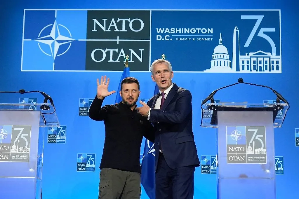 Йенс Столтенберг (справа) и Владимир Зеленский (слева) после окончания совместной пресс-конференции на 75-м саммите НАТО. Обложка © AP/TASS
