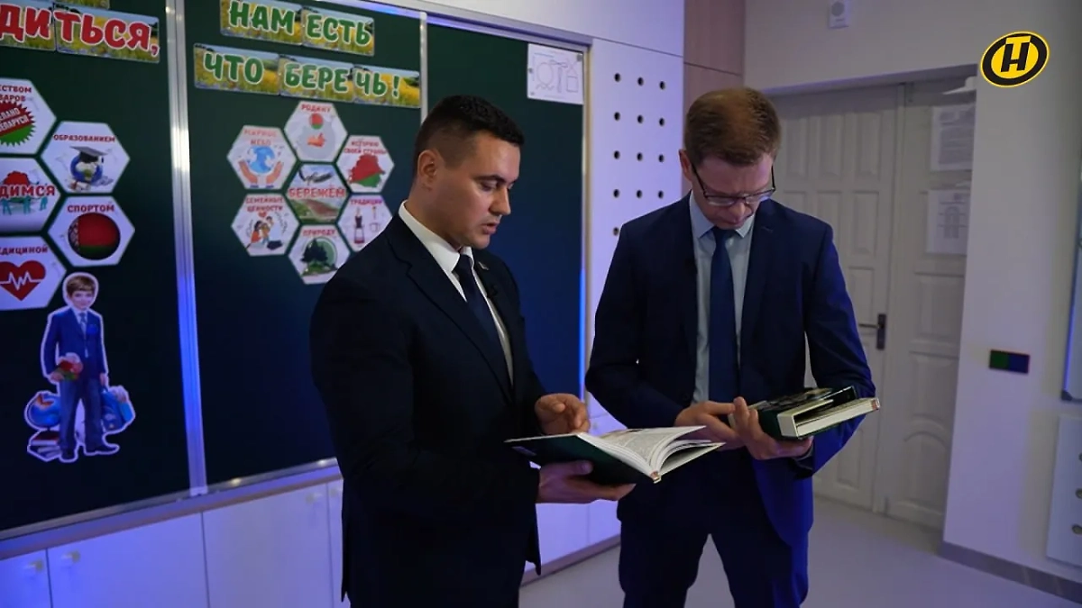 Министр образования Белоруссии Андрей Иванец и журналист ОНТ листают новый учебник по истории. Обложка © Telegram / ONT NEWS