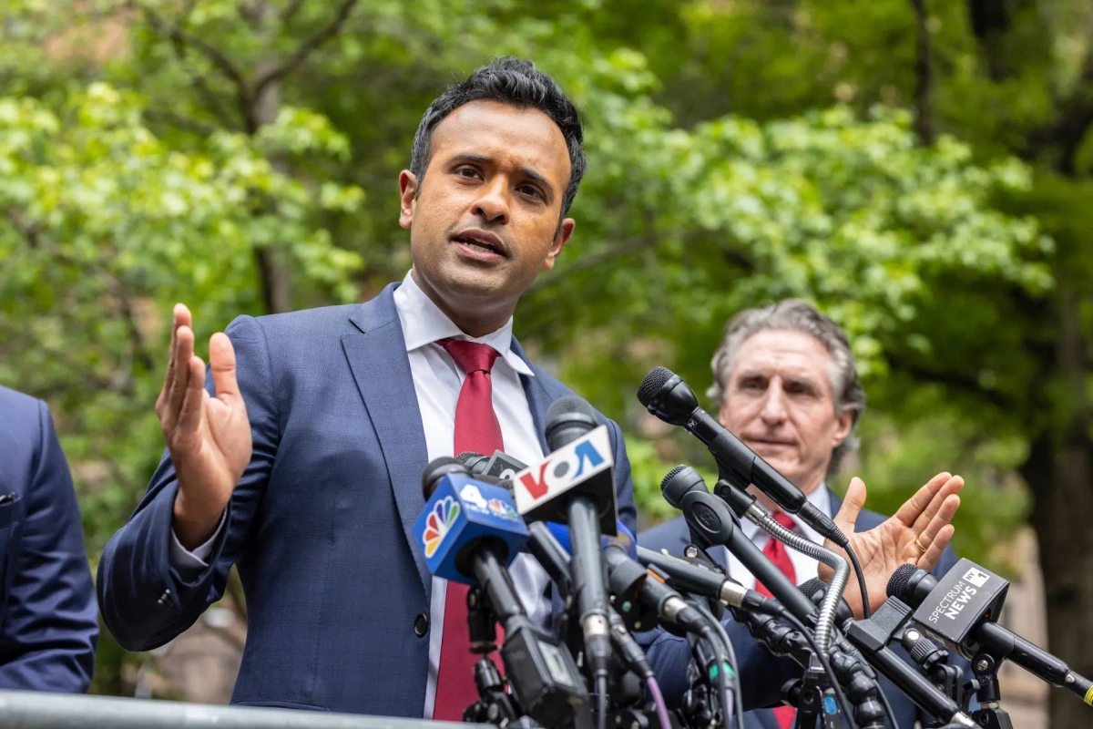 Американский бизнесмен Вивек Рамасвами во время общения с прессой у суда. Обложка © ТАСС / Stefan Jeremiah
