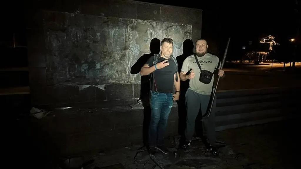Владислав Балинский и Демьян Ганул у разрушенного барельефа в Одессе. Обложка © Telegram / GANUL