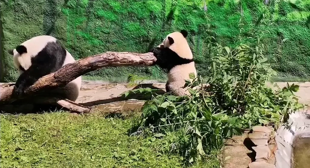 Панда Катюша весело проводит время в Московском зоопарке. Гендиректор учреждения Светлана Акулова показала видео, где маленький бамбуковый медведь схватился за край большой коряги и уронил её на маму. От наказания в виде «кусь» Катюша благополучно сбежала.