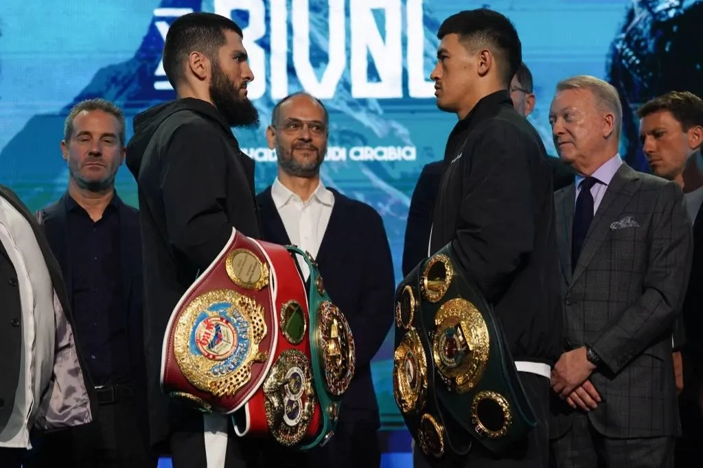 Бивол и Бетербиев сошлись в жёсткой битве взглядов с трофеями в руках